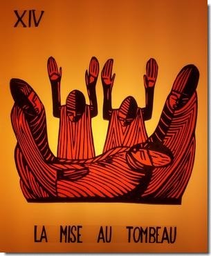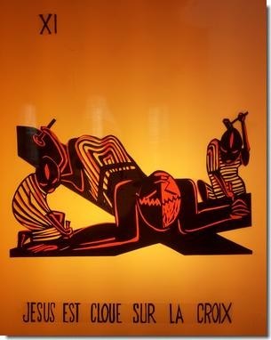Ce chemin de croix, reprise d'une oeuvre du père Mveng, artiste-jésuite camerounais assassiné en avril 1995, est visible en l'église Saint-Paul-des-Nations à Noisy-le-Grand.