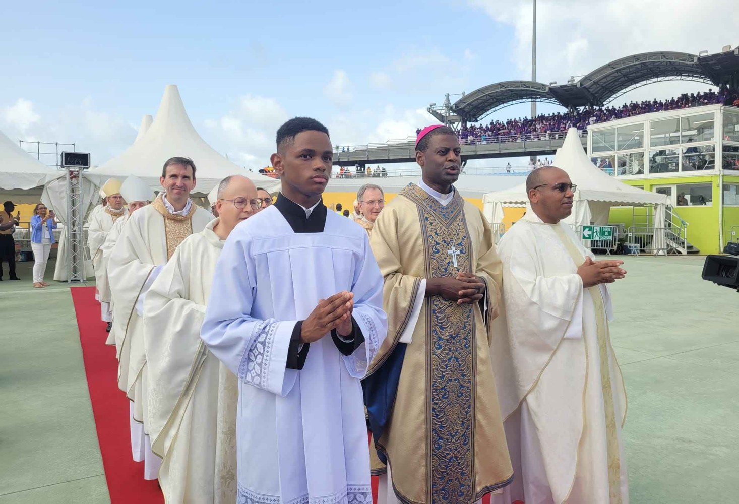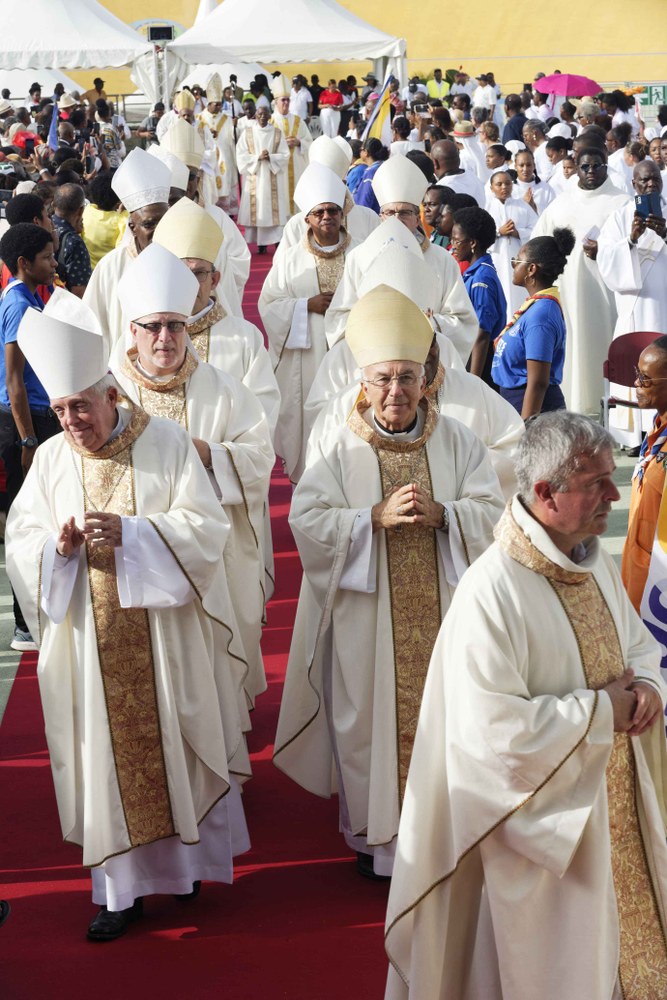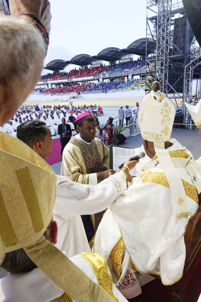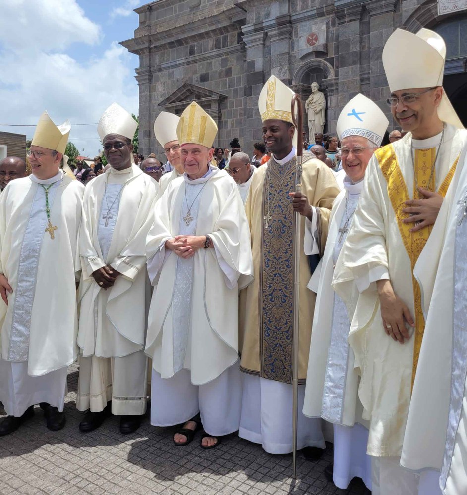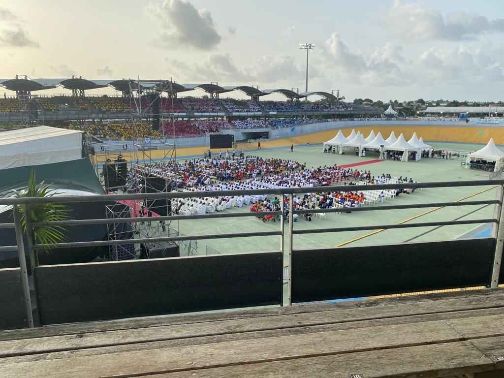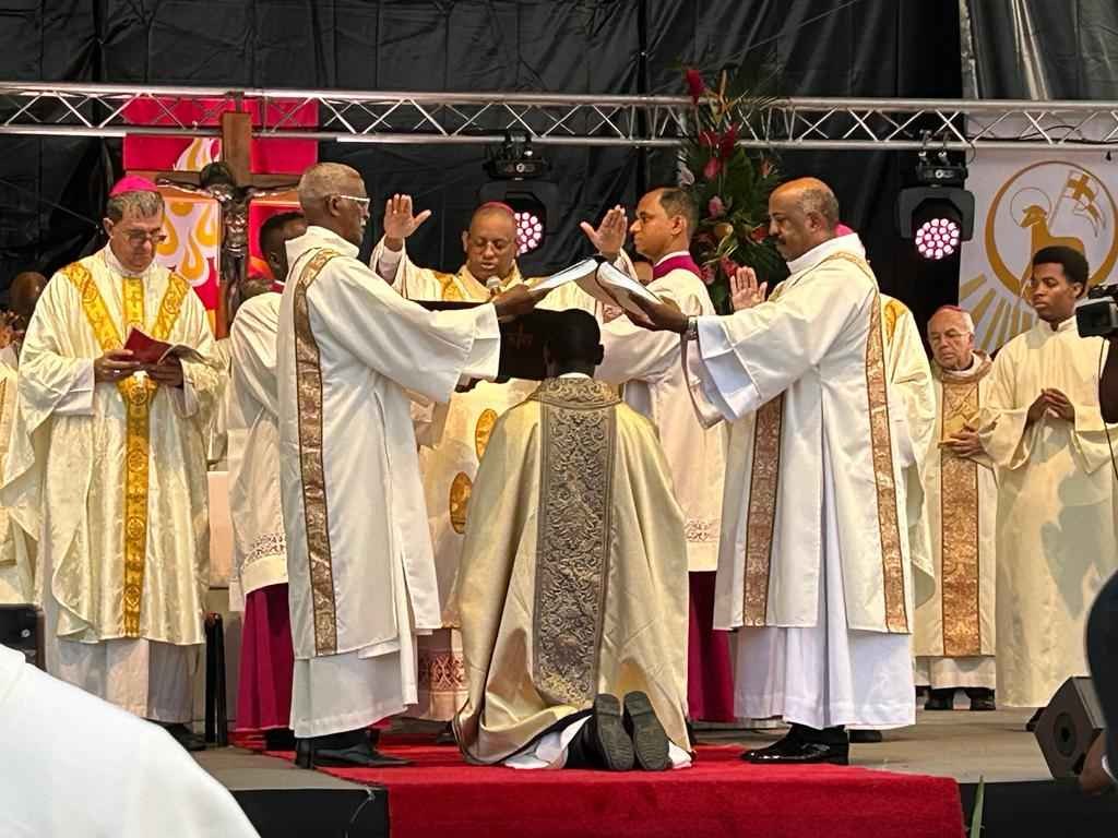 Photos-souvenirs de l'ordination épiscopale du Père Philippe Guiougou, le 9 juillet 2023, au vélodrome de Gourde. Notre ancien vicaire général est officiellement installé comme évêque de Basse-Terre et Pointe-à-Pitre.