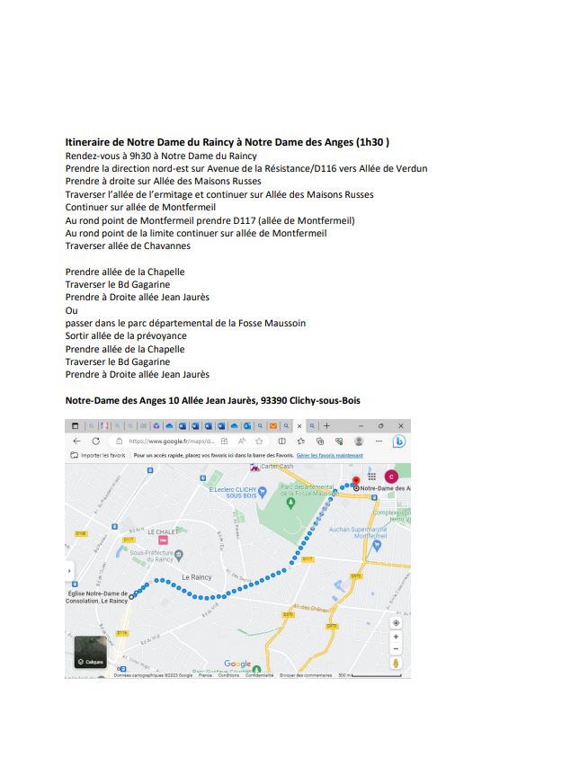 A 10h00, le dimanche 10 septembre : Départ de la marche sur le parvis de l'église Notre-Dame-du-Raincy en direction de Notre-Dame-des-Anges, à Clichy-sous-Bois (Un tracé unique cette année, pour le pèlerinage, au départ du Raincy et un tracé plus court, au départ de la mairie de Clichy, pour les personnes qui ne souhaitent pas ou ne peuvent pas cheminer autant). Consulter le livret.