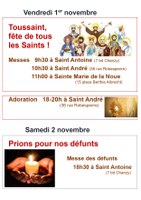 Messes du Vendredi 1 er Novembre : 9h30 St Antoine, 10h30 St André, 11h00 Ste Marie de la noue et de 18h00 à 20h00 Adoration à St André